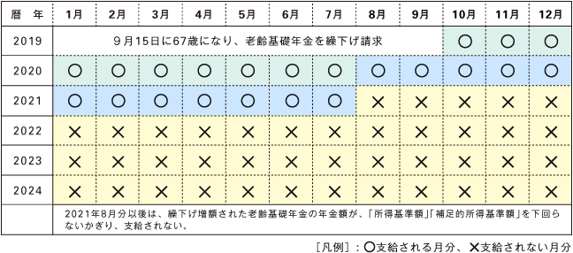 なお、2021年8月分以後は、繰下げ増額された老齢基礎年金の年金額が、「所得基準額」「補足的所得基準額」を下回らないかぎり、「老齢給付金」「補足的老齢給付金」とも、支給されません。